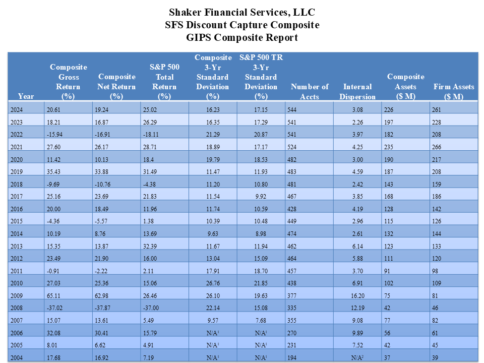 Shaker Financial Services, LLC claims compliance with the Global Investment Performance Standards (GIPS®) and has prepared and presented this report in compliance with the GIPS standards. Shaker Financial Services, LLC has been independently verified. The SFS Discount Capture Composite has been examined for the periods June 30, 2004 through December 31, 2024.